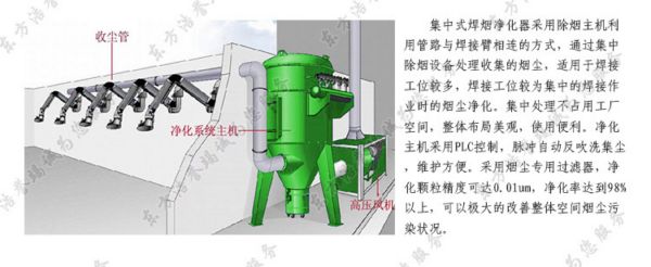 主要净化方式是在大型综合车间,厂房的车间外安装净化系统,车间内设置引风管道,将室内烟气引至管道系统处理并排放,通过自由移动吸臂为零散焊接点净化烟气,工作原理通过风机引力作用,焊烟废气经万向吸尘臂或吸风口吸入滤芯过滤室,利用重力与上行气流,首先将粗粒粉尘直接降至灰斗,微粒烟尘被滤芯铺集在外表面,洁净气体经滤芯过滤净化后流后洁净室:滤芯的更换和清理通过压力显示提示---清灰采用压缩空气脉冲自动清灰,吏设备可长时间高效收集烛烟的高效除尘设备。