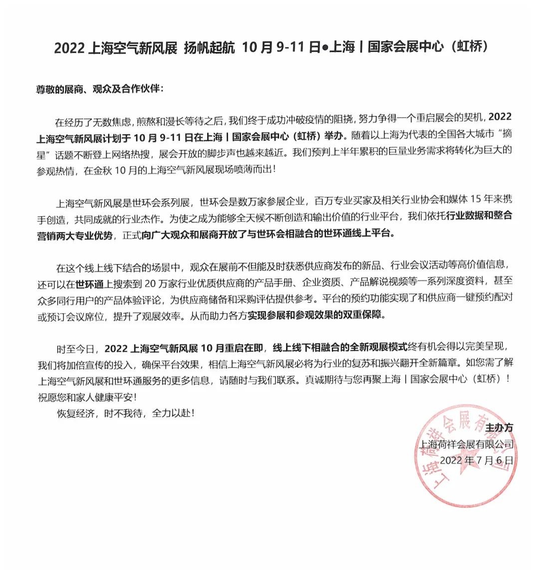 金秋十月 扬帆起航丨2022上海空气新风展新档期确认!