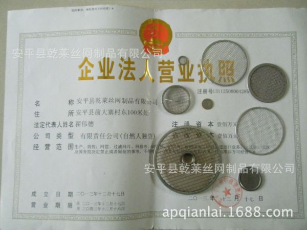 我厂的过滤网片是按Q/9Dm110-92 《纺丝机喷丝头过滤片》和Q/9Dm110-93《纺丝机喷丝头密封垫》成系列配套组件生产的、保证产品质量,以满足用户使用要求。