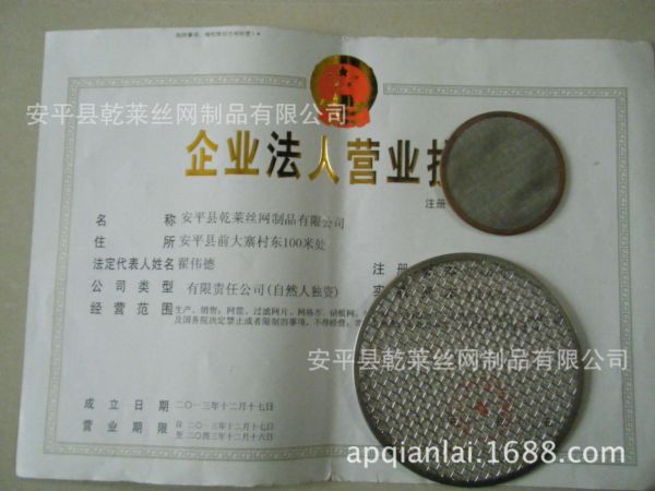 安平县乾莱过滤器材主要生产过滤网、不锈钢包边网、过滤片、不锈钢丝网、不锈钢席型网等丝网深加工产品材质:可使用不锈钢编织网、黑丝布、镀锌铁丝网和其它金属为原料。过滤网有单层、多层之分;按外形又能分为圆形、矩形、腰形、椭圆形等。不锈钢过滤网主要用于橡胶、塑料工业、粮油筛分等。我公司生产的过滤网片及不锈钢过滤网,可按要求加工。网片直径:5毫米到600毫米。执行标准:金属滤网是严格按GB5330-85 标准组织生产。过滤网适用于石油、化工、轻工、医药、冶金、机械、船舶、汽车拖拉机等工业中的蒸馏、吸收、蒸发、过滤等工艺过程,消除夹带在蒸汽或气体中的雾滴和液沫,以及汽车拖拉机上用作空气滤清器。