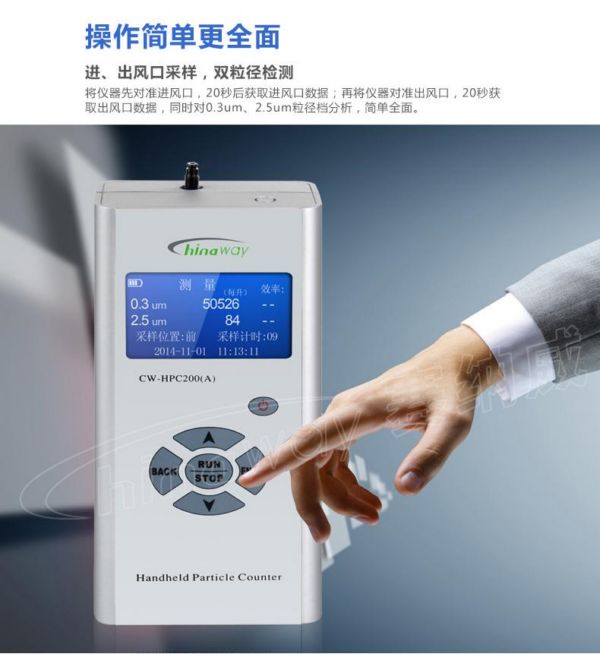 CW-HPC200(A)空气净化器净化效率检测仪是专用于测量空气净化机进出气风口单位体积内的尘埃粒子数,并根据进出气口尘埃粒子的个数计算出净化效率的仪器。
