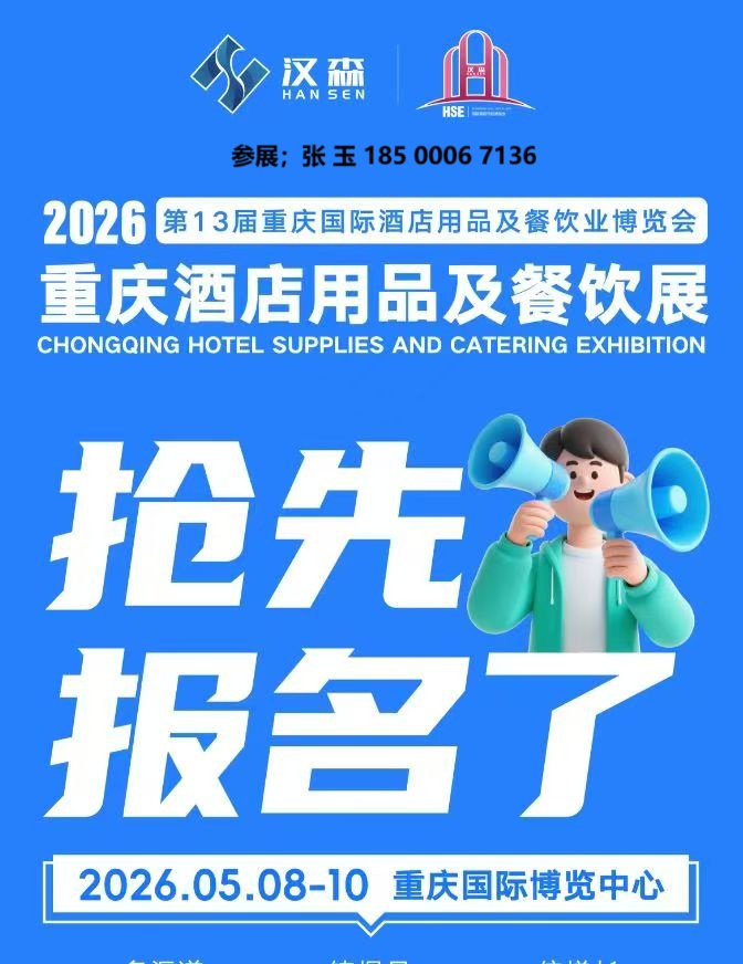 与此同时,由多方权威机构联手共同打造的2026第13届重庆国际酒店用品及餐饮业博览会将于2026年5月8-10日在重庆国际博览中心举办,预计展会规模将达到80000平方米,预计吸引超过100000位来自全国各地的专业观众,展商数量将超过2000家。展品品类包含:酒店用品、智慧厨房、食品机械、桌面用品、酒店家具、客房用品、智慧酒店、酒店建材、清洁用品、外卖包装、咖啡饮品、餐饮综合等,同时展会更加专业化、市场化、国际化。同时展会紧跟当前国内酒店餐饮业趋势和国家战略,还将结合丰富多元的创投互动和行业交流活动,形成品牌高效展示与资源高效整合,为酒店餐饮业业内人士传递前沿资讯、发展趋势报告、大咖经营思维、盈利秘笈等精彩内容。5月“山城”重庆,渝您相约!