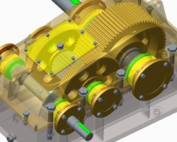 分流式二级减速器。Creo2.0全参数化设计。不同于常见的展开式(普通)二级减速器,共有6个齿轮。分流式减速器的优点在于它的齿轮相当于轴承是对称分布的,所以它承载齿轮的轴所受的弯扭组合应力比较均匀。而展开式由于齿轮与轴承不对称,因此要求其轴有更大的刚度。课程设计可以参考。