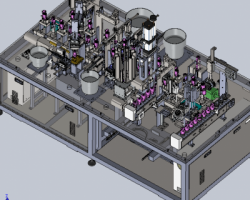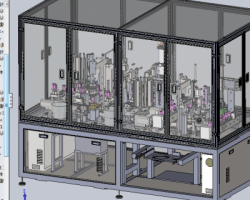 微型马达组装机非标设备,全自动直流电机组装线3D数模,该自动化线设备能满足后盖自动铆轴承功能;由于组装和功能工位非常多无法介绍现只能简单的初步介绍以下功能:机壳自动装配机,后盖铆轴承机,铆轴承压花针结构与现有的保一致,所有组装和铆压焊接点胶等品质都是经过测试的,设备总体运行稳定。轴承压簧压贴无变形翘起,四铆点压接可靠;轴承摆力2.8~8kgfcm; 气缸、油压机需保证产品铆压可靠;所以在设计时已经把结构设计的非常紧凑了。加胶位置与样品保持一致;其余位置不允许有胶; .机壳完成后不允许变形,刮伤. .轴承压簧压贴无变形翘起,四铆点压接可靠; .轴承摆力2.8~8kgfcm;设备有手动调整功能,手动状态下,机器各动作在触摸屏上有相应按键,及信号输出指示;这套全自动的直流电机组装生产线图纸,是对针微型小马达而开发的一条无人化自动线,设备为后盖与定子机壳整体为1人操作上下料,节拍为≤5秒,单机转产时间≤5分钟;机器为全自动操作,正常情况下无需人工干预,上、下料机械手分别有装/卸料功能,另外设备能满足机壳自动铆轴承、入磁瓦、充磁、焊接端子、加胶功能,还有机壳、轴承、轴承压簧、磁瓦、弹弓、端子、胶水自动送料(机壳手动排列),机壳充磁后自动检测充磁后的磁通量,不合格品需检出,有不良品检出储蓄机构,有连续不良停机报警功能及加胶机A、B胶搅拌、混合均匀;是一条功能最全的电机组装线。