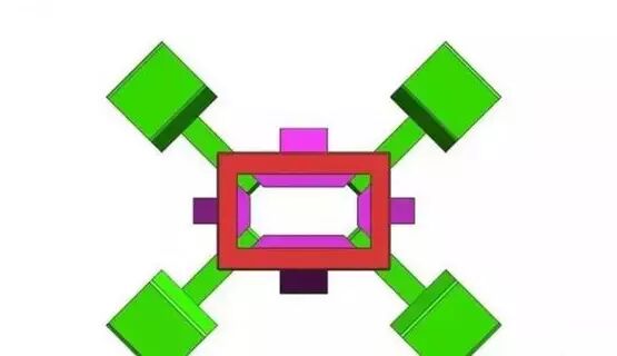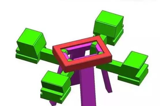 斜顶无法完全脱倒扣,我们只能考虑能否用斜顶+内滑块的方式进行设计。如下图所示,绿色部件为内滑块,粉红色部件为斜顶。