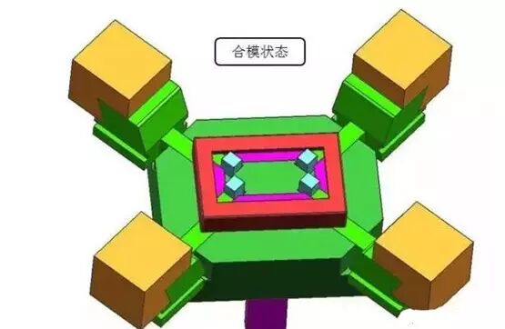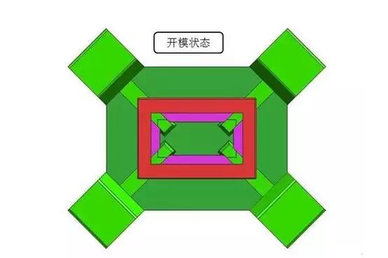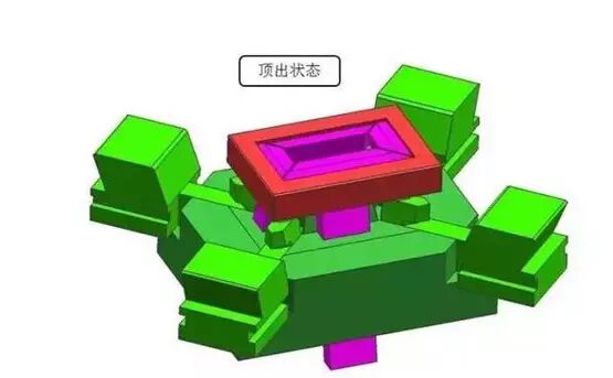 前后模部分打开,由于铲机斜度的作用驱动内滑块向内侧移动,先脱离产品4个角落的倒扣,然后4支斜顶顶出产品,同时脱离倒扣,取出产品,合模进行下一个生产。