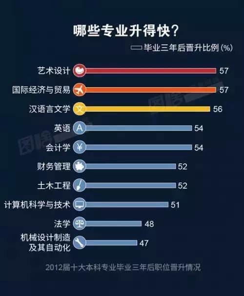 晋升较快的专业排名则和前两份大不相同。艺术设计、国际经济与贸易、汉语言文学位列前三;而在收入、就业率中稳居榜首的计算机科学与技术,则同法学、机械设计制造及其自动化,位居末尾。