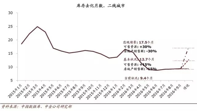 目前数据显示截至9月底,一、二线城市的库存去化月数分别为9.3、9.4 个月,情景分析显示2017 年供需关系不会有太大改观。