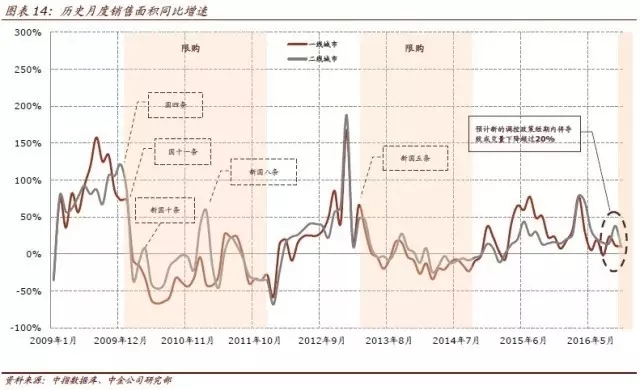 1、2016 年四季度和2017 年一季度:参考2010和2013 年政策收紧时期的经验,近期销售面积同比下降30~40%是在预期范围内的。