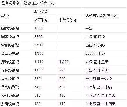 办事员2800元;科员3000元;副科级 3100元;正科级 3300元;副处级 3600元;正处级 4000元;副厅级 4400元;正厅级5000元;副部级 5500元;正部级 6000元。